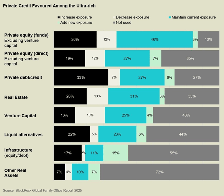 The report highlights increasing participation from ultra-high-net-worth individuals and family offices, with global family office assets estimated at US$3.1 trillion. Knight Frank's inaugural Family Office survey found 37% of respondents intend to increase indirect real estate exposure over the next 18 months, while BlackRock's 2025 Family Office survey shows nearly one-third want to increase private credit allocations -- the highest of any asset class.