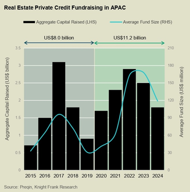 - Australia leads regional activity, capturing 40% of the US$11.2 billion raised between 2020 and 2024. Private credit now accounts for an estimated US$50 billion or 16% of total commercial real estate lending in the country, as conservative bank policies push more borrowers toward specialist private credit funds.